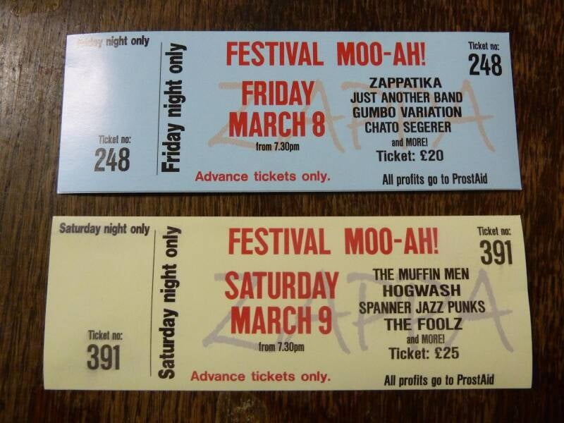 Festival MOO-AH! was launched as a biennial festival of LIVE Frank Zappa music and more at The Raven in Corby in March 2013, with all profits going to PROSTaid.